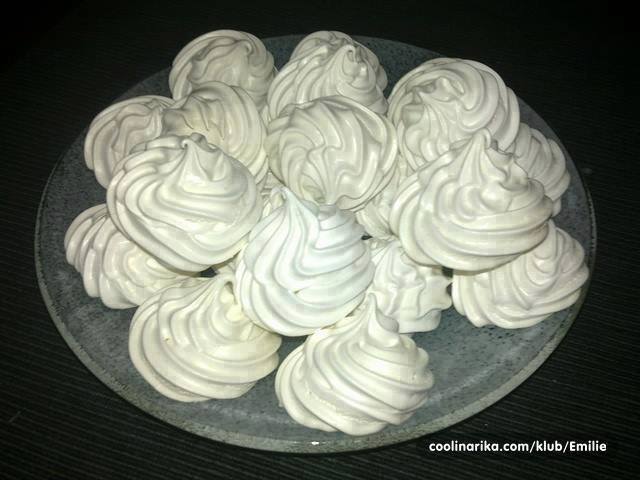 Recept je stvarno jednostavan…po bjelanjku se doda 7 dkg šećera i dugo se ,dugo miksa Tokom miksanja doda se pol žličice Cream of Tartar ili kako smo uvijek radili mrvicu soli Kada je dobro, dobro izmiksano puslice se istiskuju ili špricom ili žlicom na lim obložen papirom za pečenje. S obzirom da ja nemam ventilacijsku pećnicu ja prilikom pečenja lagano odškrinem vrata pećnice drvenom kuhačom,